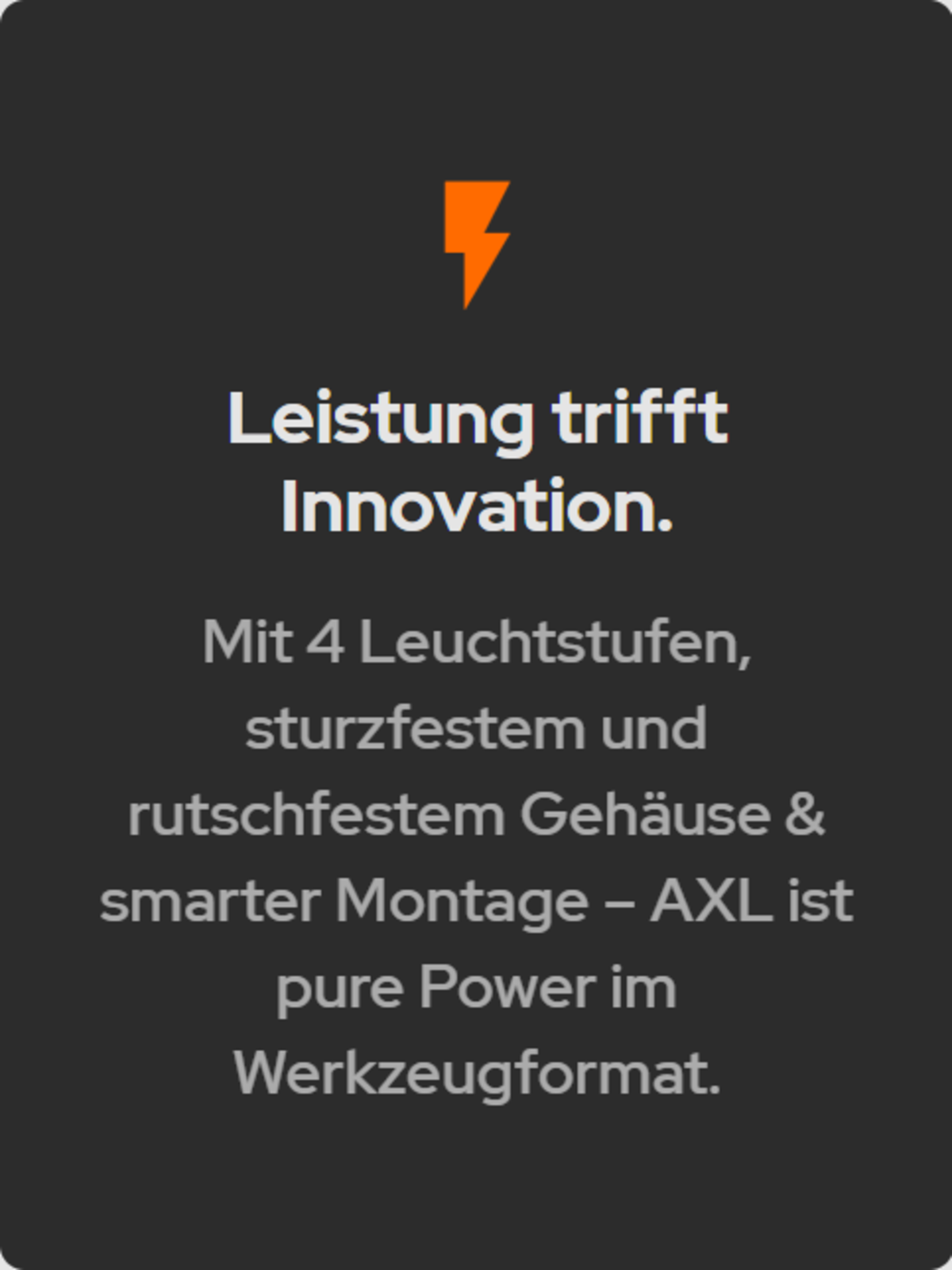 Mit 3 Leuchtstufen, sturzfestem und rutschfestem Gehäuse & smarter Montage – AXL ist pure Power im Werkzeugformat.